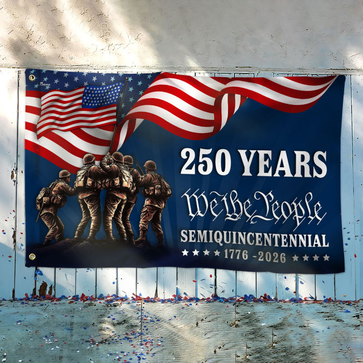 The powerful design features brave soldiers raising the American flag alongside the "250th anniversary" text and "Semiquincentennial" commemoration details spanning 1776-2026. Every time you look at this flag, you'll feel connected to the incredible journey of our nation.