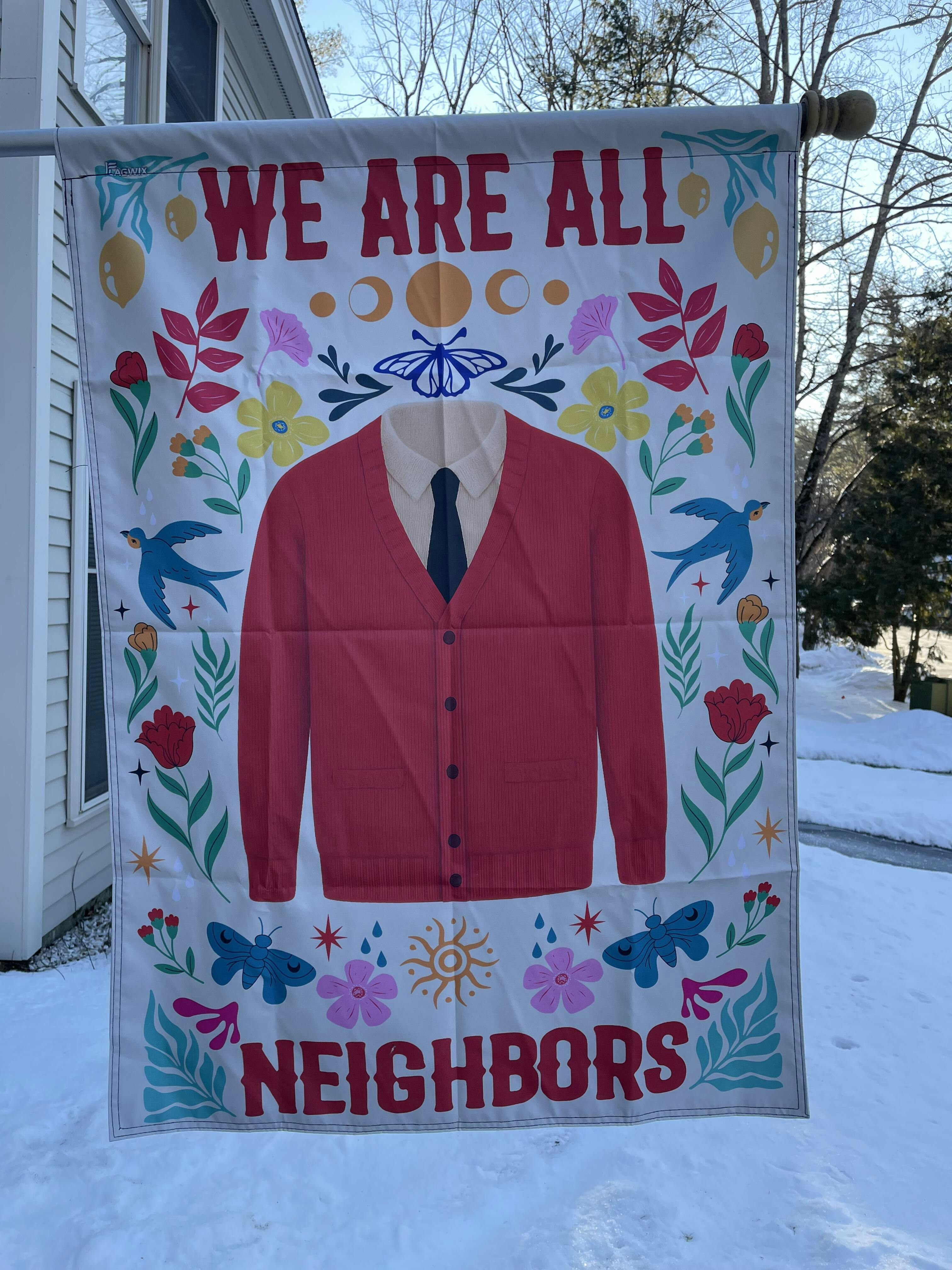 The “We are all Neighbors” flag calls for attention. Living in a condo community of 112 families challenge mini-mirrors the world we live in. The bright colors and even brighter saying reminding us of a gentle teaching has been a hit with my neighbors. We’ve all needed to be reminded. higher quality than expected, and I love that the saying is on both sides. Our middle-school teacher neighbor was even inspired to do a classroom bulletin board on the theme. I've been looking for a Mr Roger’s themed flag for a while. Glad I found this. Hoping it heals some angry hearts.