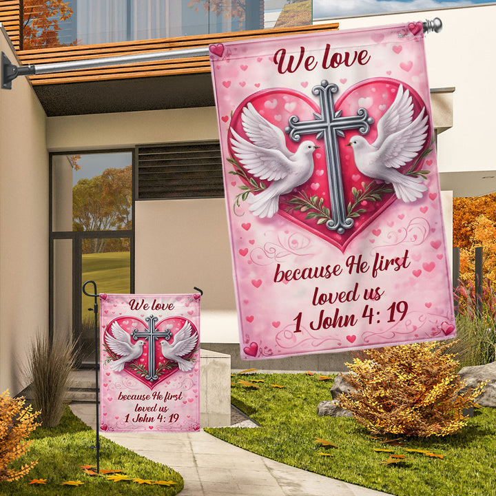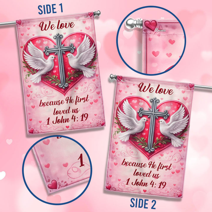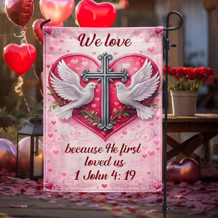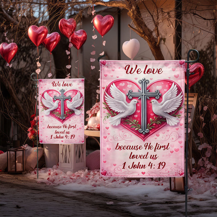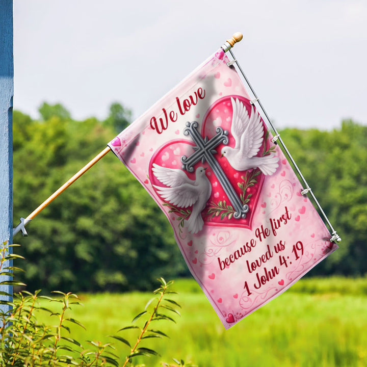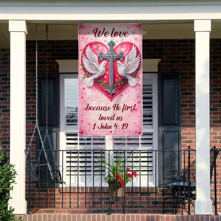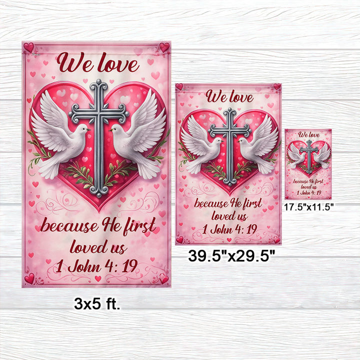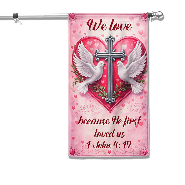 Christian Valentine Flag with Doves Cross, We love 1 John 4:19 Decor
