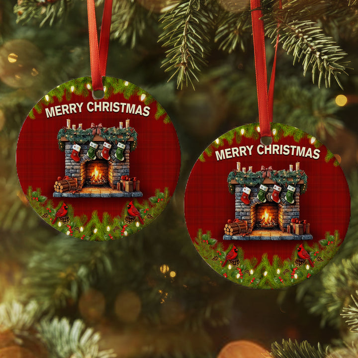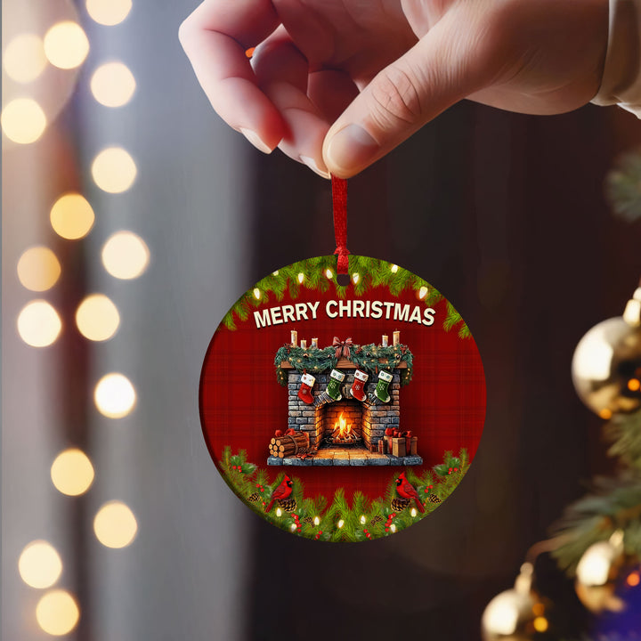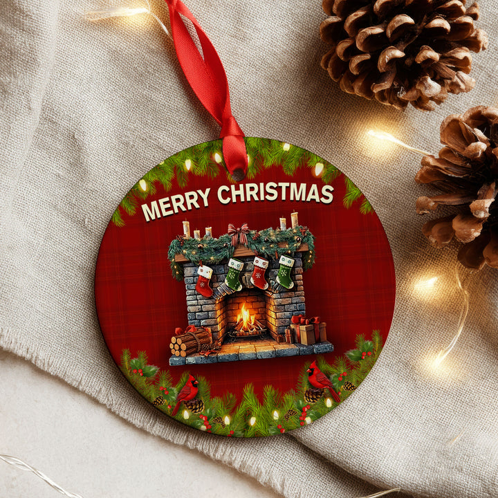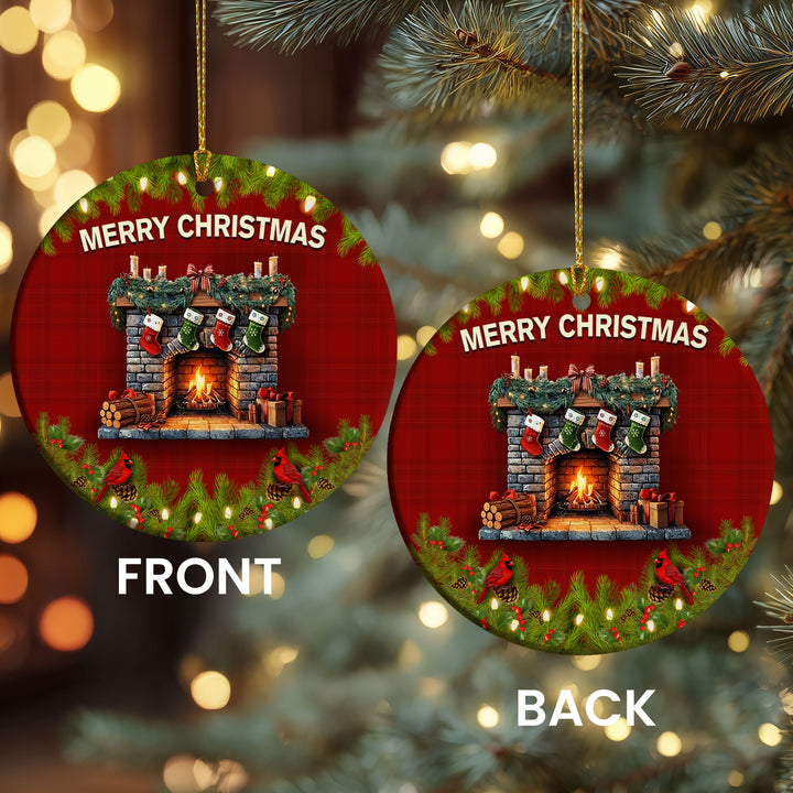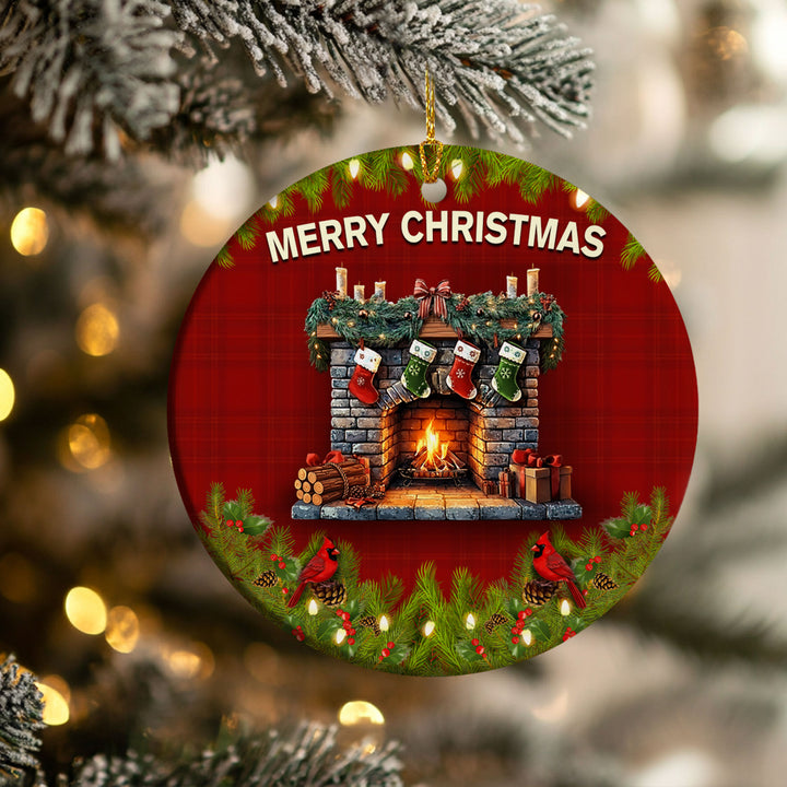Christmas Fireplace Ceramic Ornament | Cardinal Winter Holiday Decor