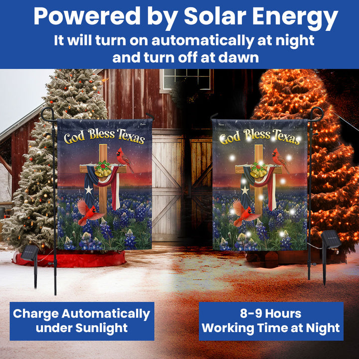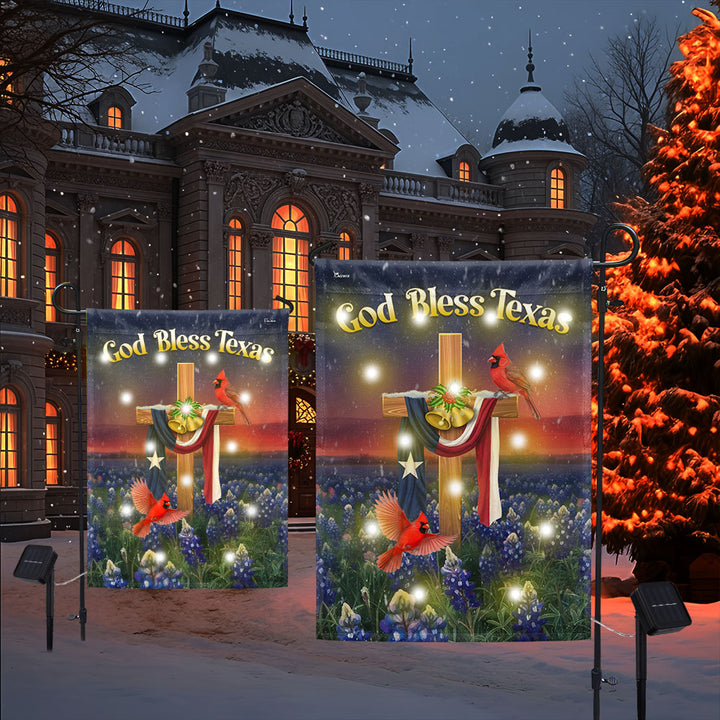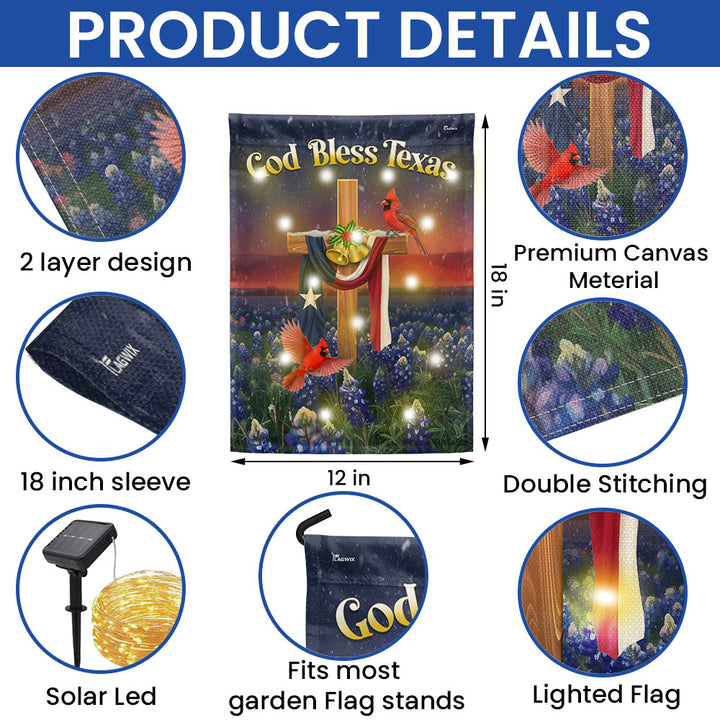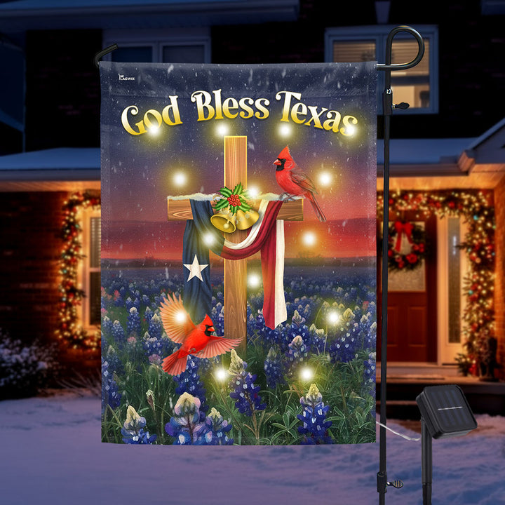God Bless Texas Flag | Texas Bluebonnets with Cardinal LED Garden Flag