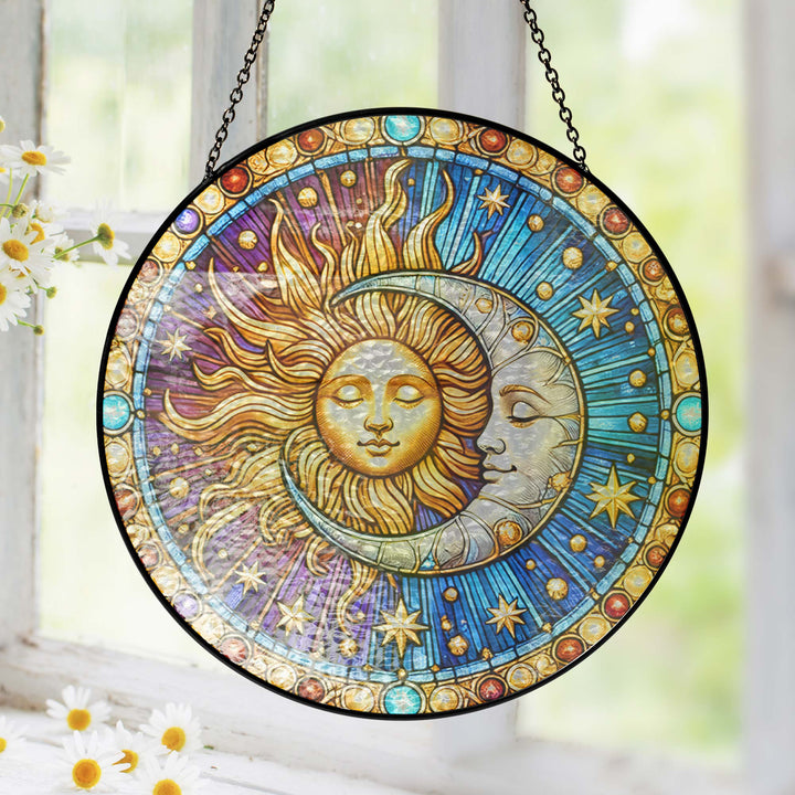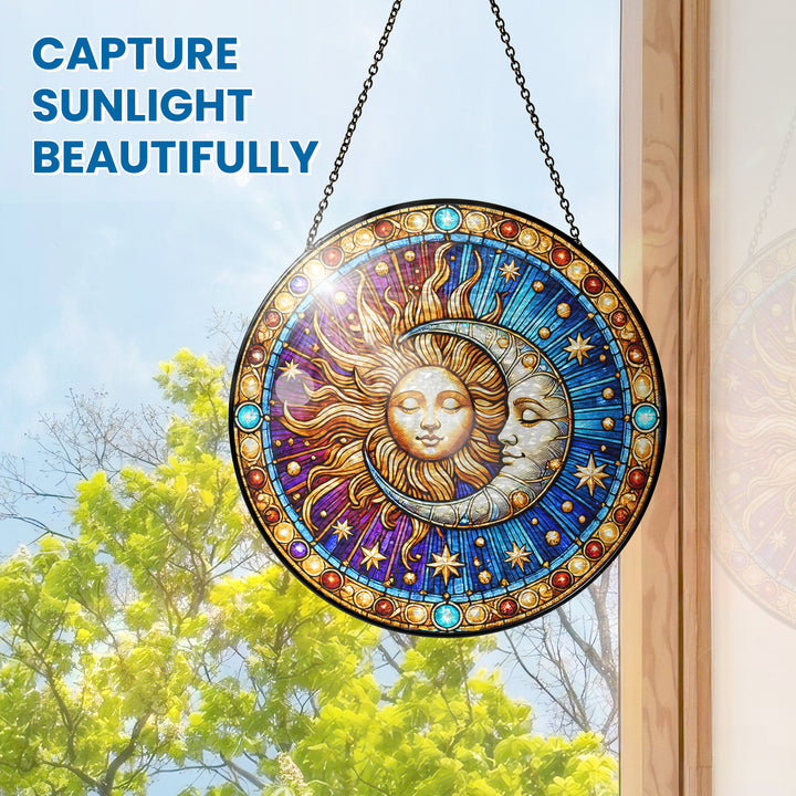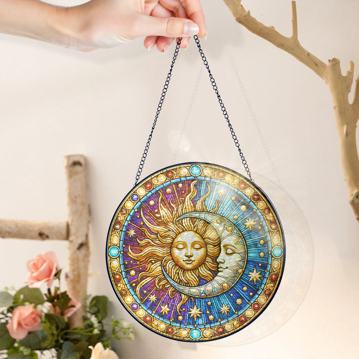 Moon Sun Stained Glass Suncatcher - Colorful Witchcraft Window Art, Handmade Celestial Hanging Ornament for Year-Round Spiritual Home Decor