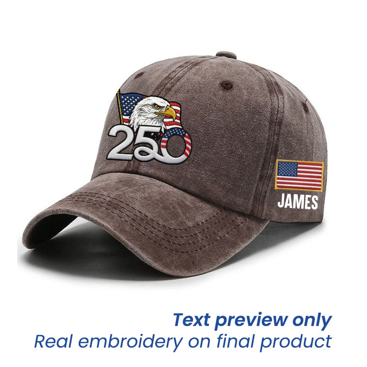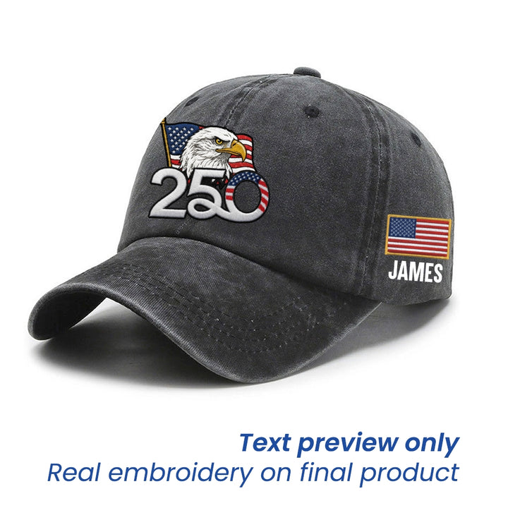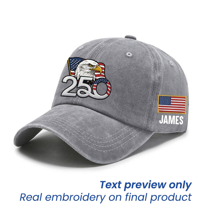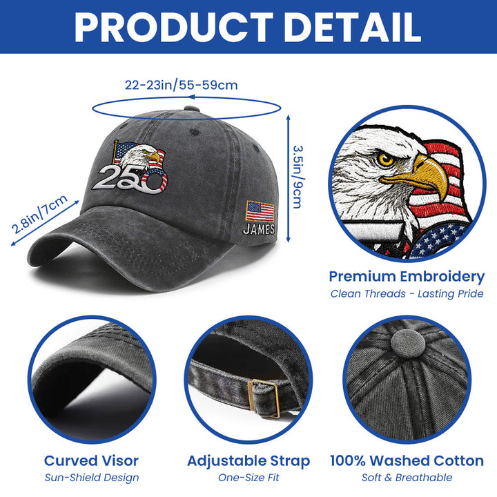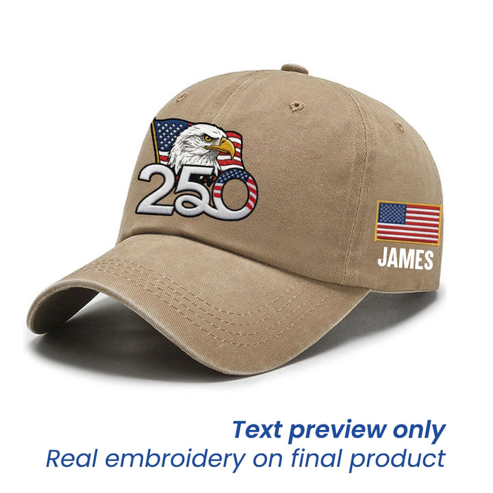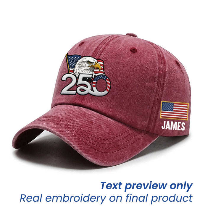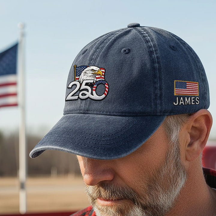 Personalized 250th Anniversary Washed Cap with Embroidered American Flag, Patriotic Cap