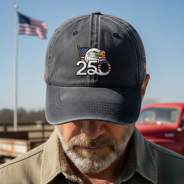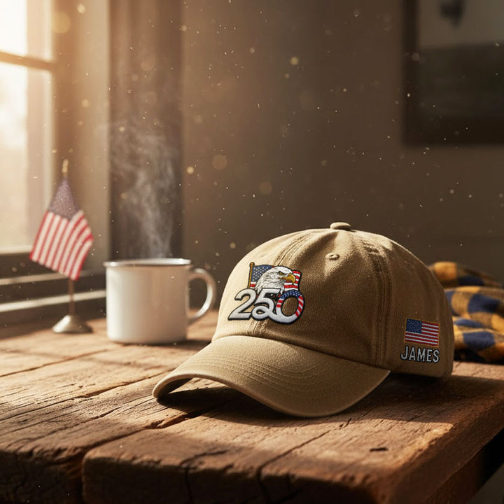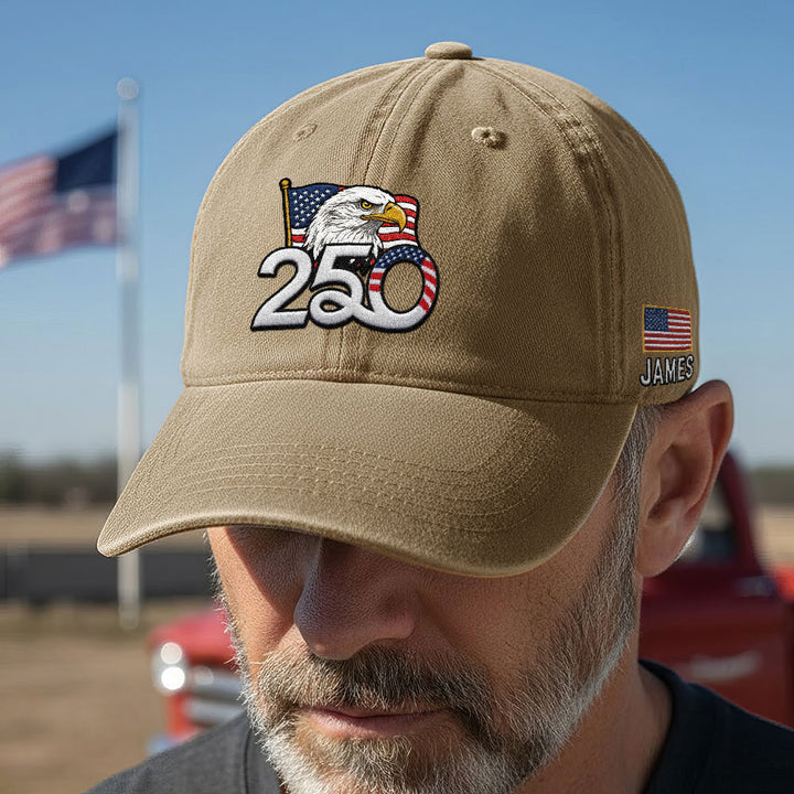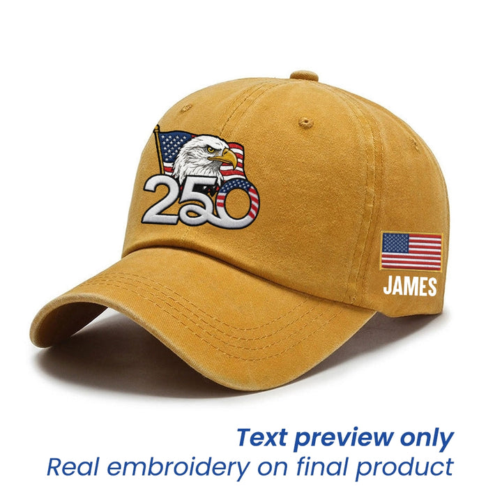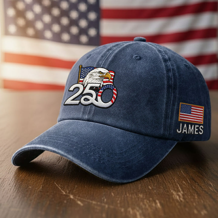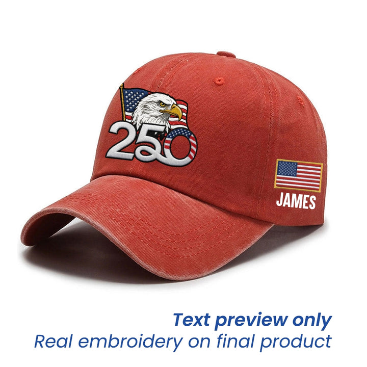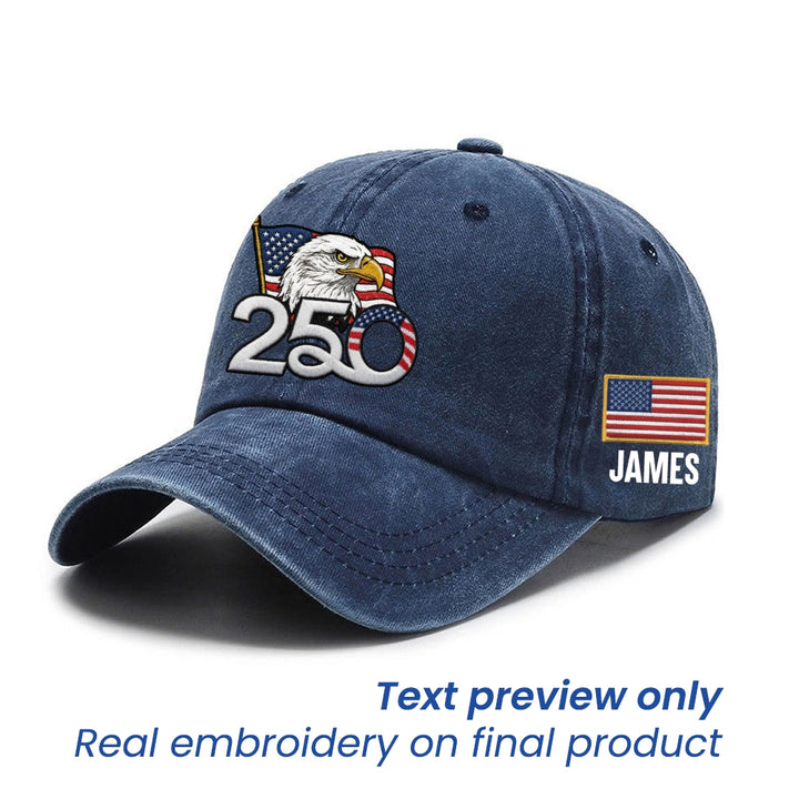 Personalized 250th Anniversary Washed Cap with Embroidered American Flag, Patriotic Cap