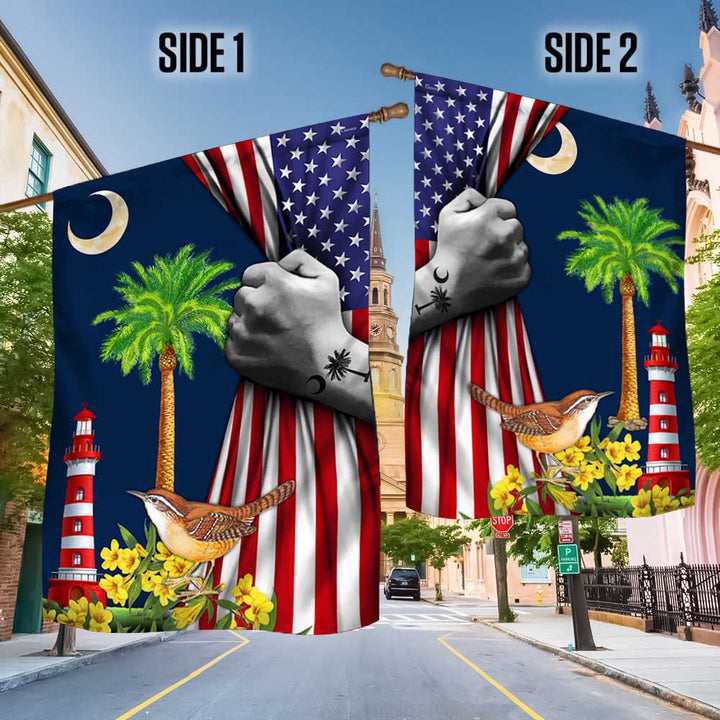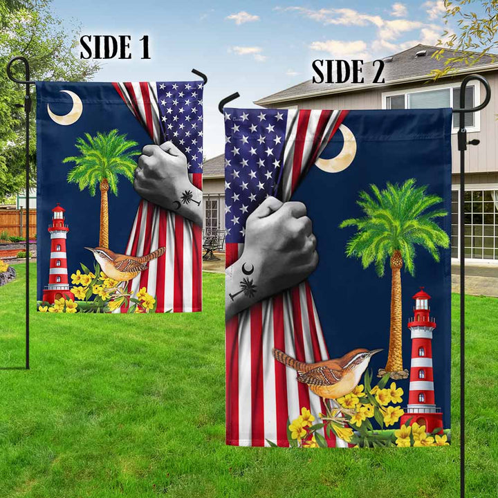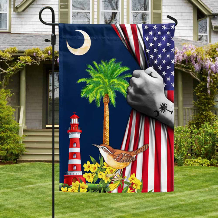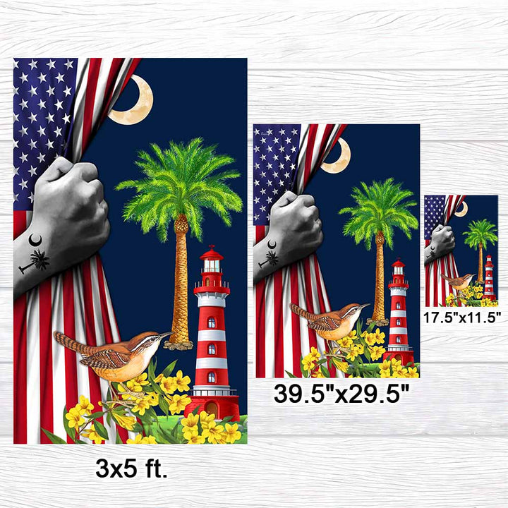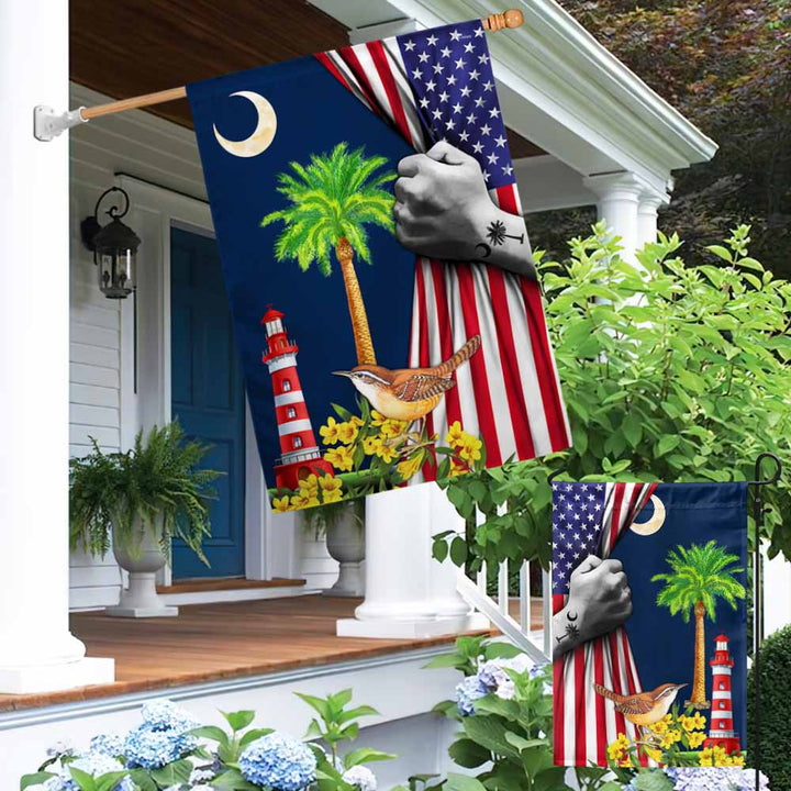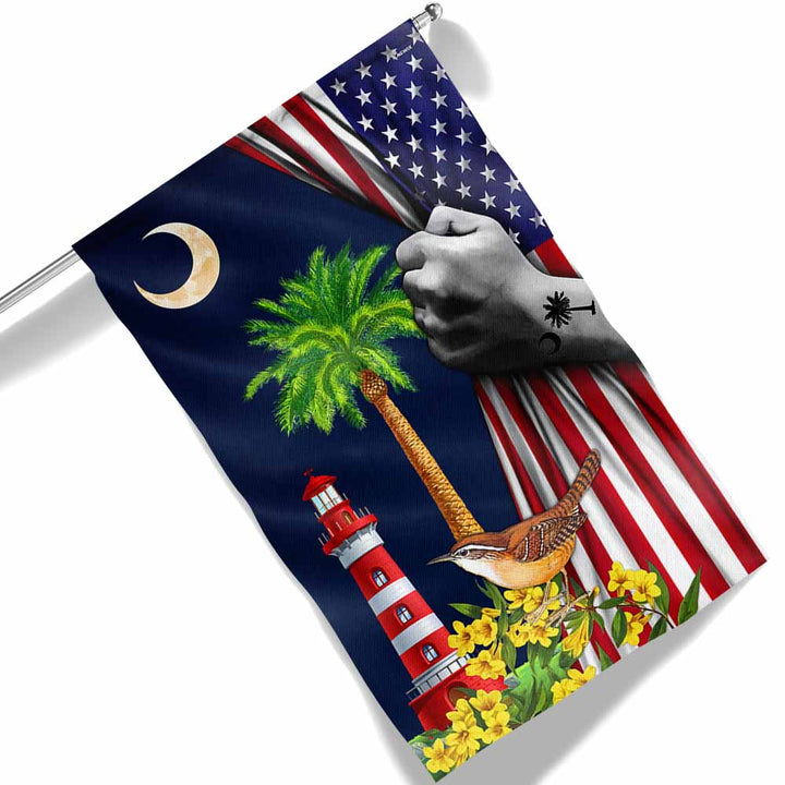 South Carolina American Flag Palmetto Tree and Moon. Carolina Wren Bird and Yellow Jessamine Flower