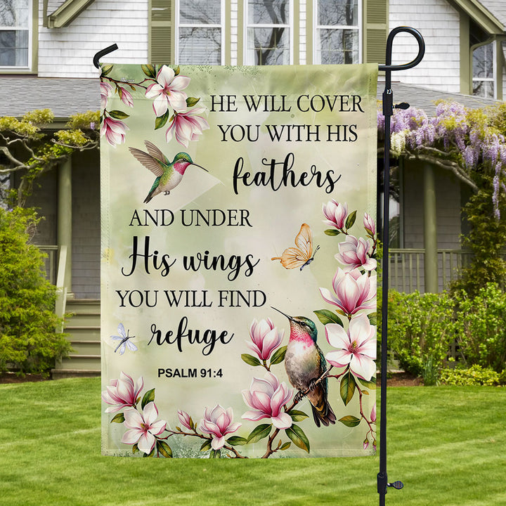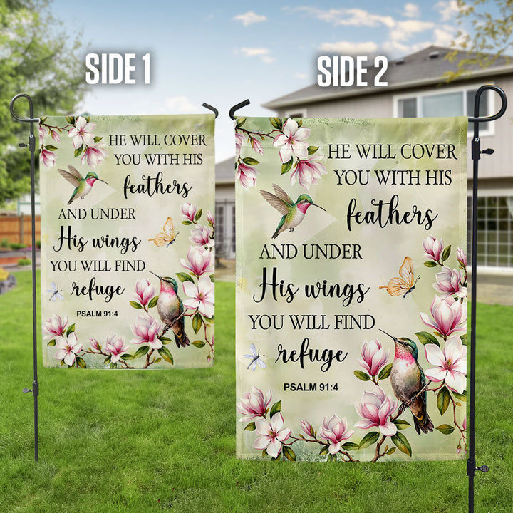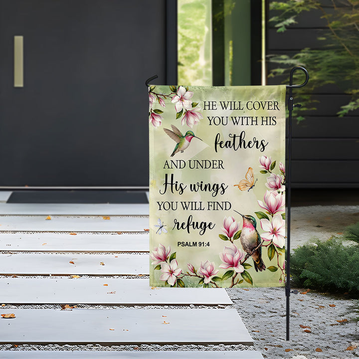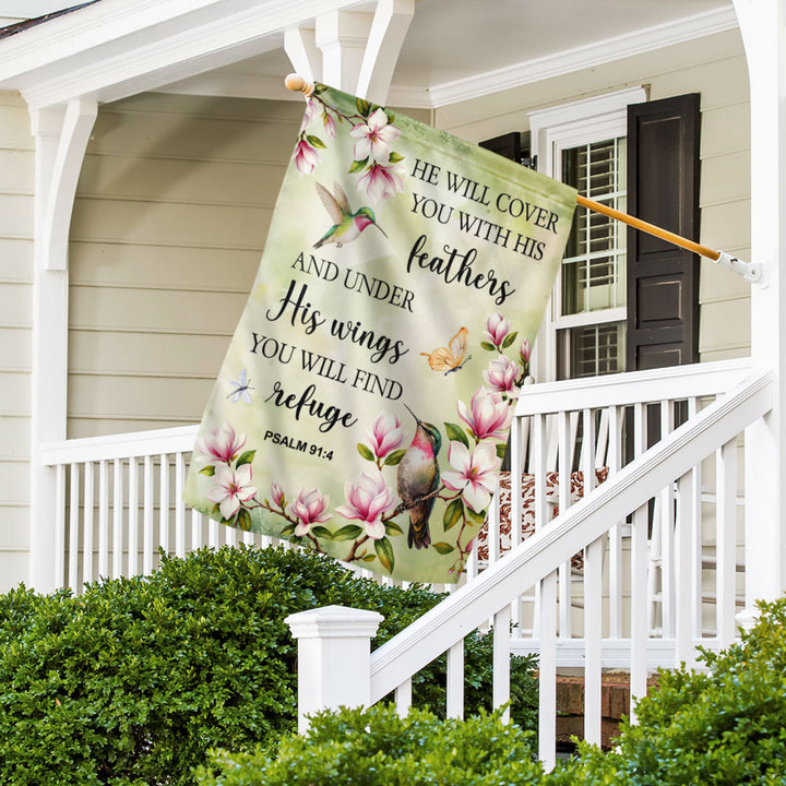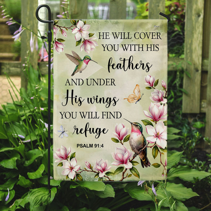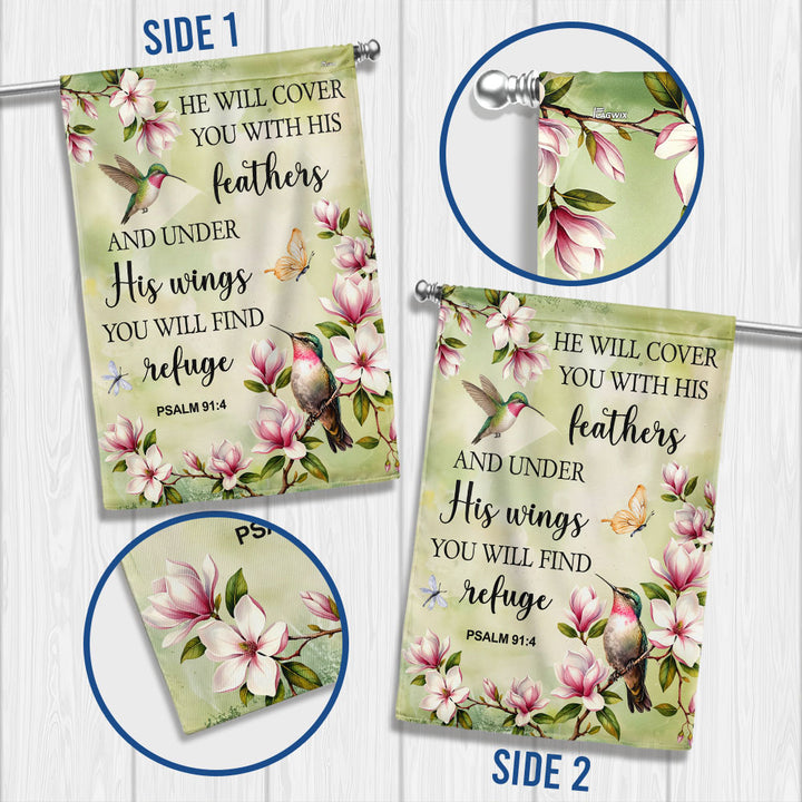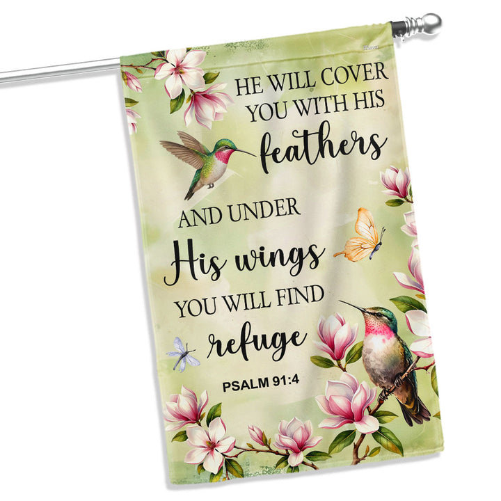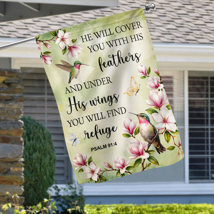 Spring Hummingbird Flag, He will cover you with Feathers Jesus Decor